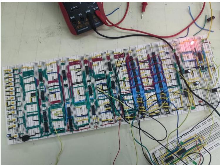 在单元电路设计、仿真、搭接、调试完成后,要求学生对电路系统进行整体功能测试,通过整理并分析现象判断单元电路是否满足设计要求,如倒计时 5 秒电路的测量,开锁电路的调测。