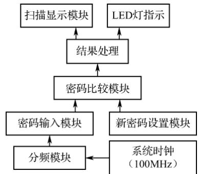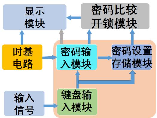 本案例要求设计实现一个 4 位电子密码锁,包含输入电路、键盘输入电路、密码输入模块、新旧密码设置存储模块、时基电路、密码比较开锁模块、显示模块等基本单元组成,其系统框图如图 1 所示。