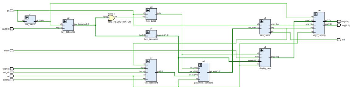 本设计由顶层模块 password_lock_top 和 9 个子模块构成。u1 为分频模块div_200hz,为后续模块提供大约 200Hz 的频率信号;u2 为按键消抖模块key_debounce,用于对输入密码的 4 个按键消抖;u3 为脉冲产生模块 key_pulse,对输入密码的4 个按键产生脉冲;u4为按键输入密码模块 key_password,用于确定按键输入的4位密码;u7为设置新密码模块 set_password,通过 8位拨码开关可以为 密 码 锁 设 置 新 密 码 , 默 认 初 始 密 码 为 “3210”;u5 为 密码 比 较 模 块password_compare,用于对比输入的密码和初始密码或新设置的密码是否相同;u6为密码锁处理模块 lock_result,用于判断输入密码是否正确,通过 LED 灯指示密码正确与否;u8 为密码锁存模块 display_reg,用于将 4 次按键数值锁存,并确定密码显示形式;u9 为动态扫描显示模块 seg7_display,前 4 位数码管显示“OPEN”或“FAIL”,后4 位显示输入的 4位密码或 4位“-”。