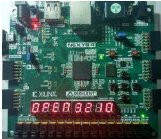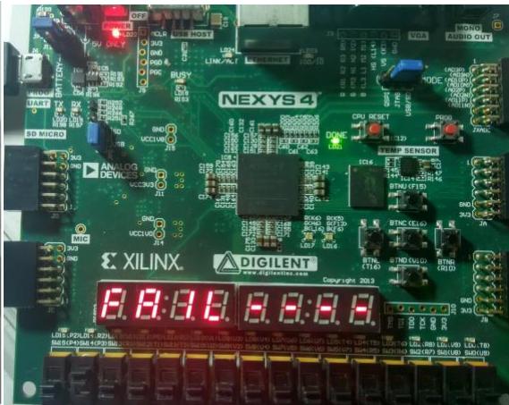 对密码锁设计添加约束文件,进行综合、实现、生成下载文件,配置下载到NEXYS4开发板上。如图 6、7所示。