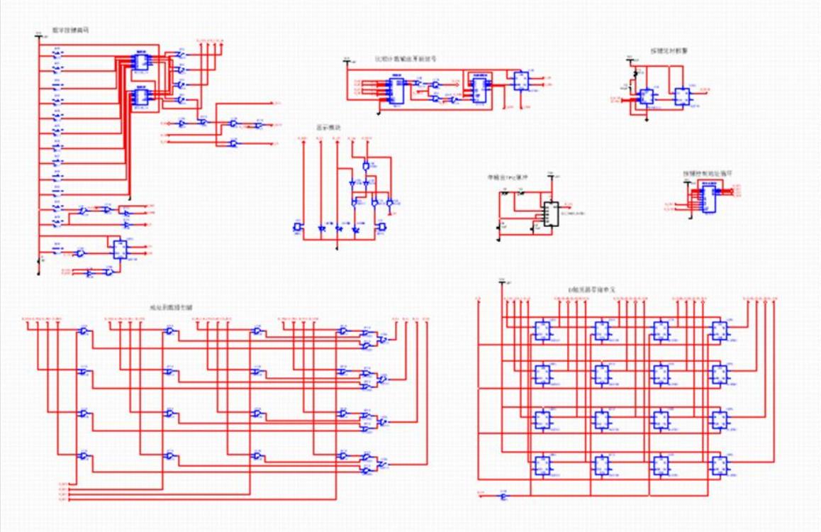 键盘输入模块:用于实现按键的可靠输入,它可以对按键信号进行译码。它的输入端接受来自按键的输入,但由于按键抖动等常会带来输入密码及输入数字位数的错误,故此部分电路常加入去抖电路。在输入控制信号的控制下,数字按键按下通过键盘输入模块,把密码输入密码模块或者密码设置模块。