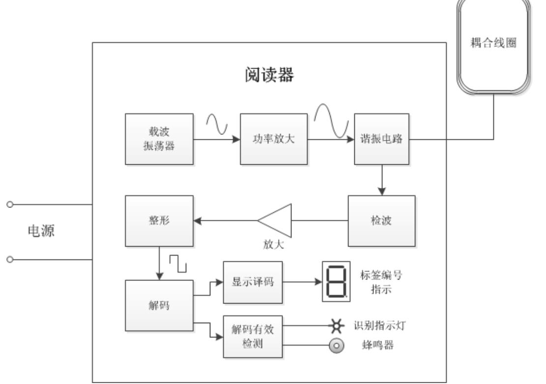 5)设计合理的阅读器方案,包括线圈耦合电路、谐振电路、检波、放大电路、整形电路、解码电路及显示电路;