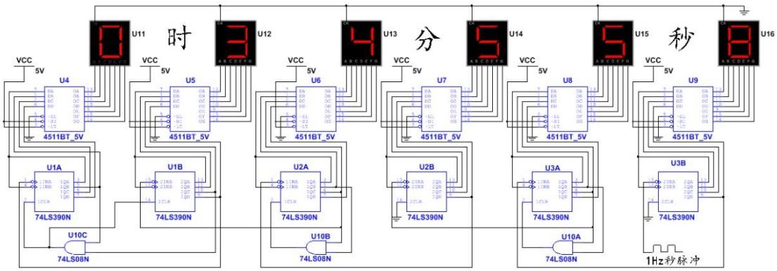 “时”、“分”、“秒”电路分别为二十四、六十、六十进制的加法计数器。“分”和“秒”计数器用两块十进制加法计数器和与门来实现,它们的个位为十进制、十位为六进制,这样符合人们通常计数的习惯。“时”计数也用两块十进制加法计数器和与门来实现,只是设计为二十四进制计数器。