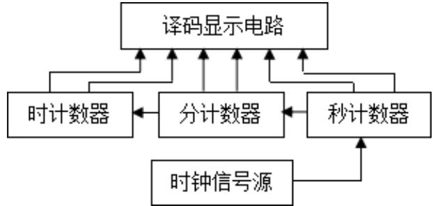 数字电子钟电路将 1Hz 的时钟脉冲信号送入“秒”计数器进行计数,在“秒”计数器完成一个计数循环时,向“分”计数器产生“进位”信号,使“分”计数器计数,在“分”计数器完成一个计数循环时,向“时”计数器产生“进位”信号,使“时”计数器计数。所有计数的结果由对应的译码显示电路显示出来。