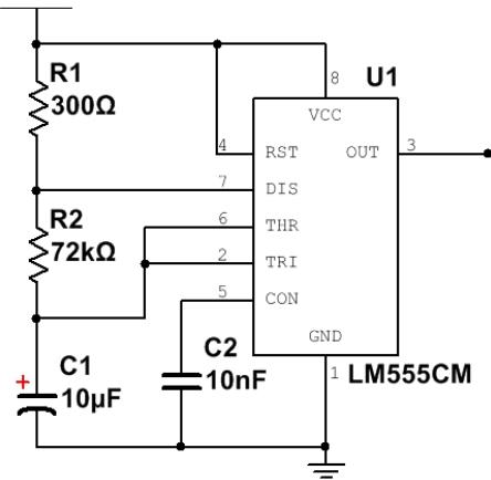 时钟信号源是由 555集成芯片、电解电容、电阻和电容搭建的周期为 $1 \mathrm { H z }$ 、占空比约为 $50 %$ 的多谐振荡器,其原理图如图 2 所示。