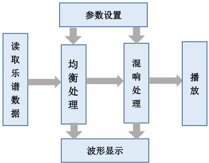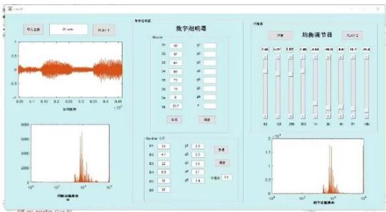 简单降噪处理并添加竹笛音色;图示均衡器实现的九段图示均衡调节,可以通过推拉界面上的位置滑块对不同的频率成分进行增强或衰减;数字混响器模块实现了Moorer模型和Gardner小厅模型,图示用户界面友好,可以手动改变参数测试混响效果。