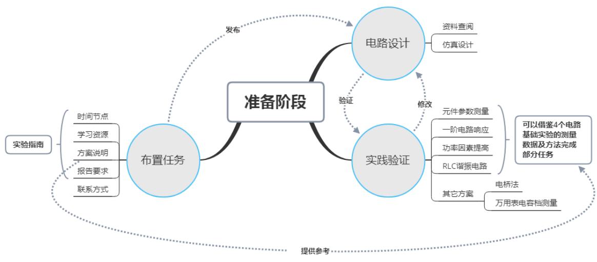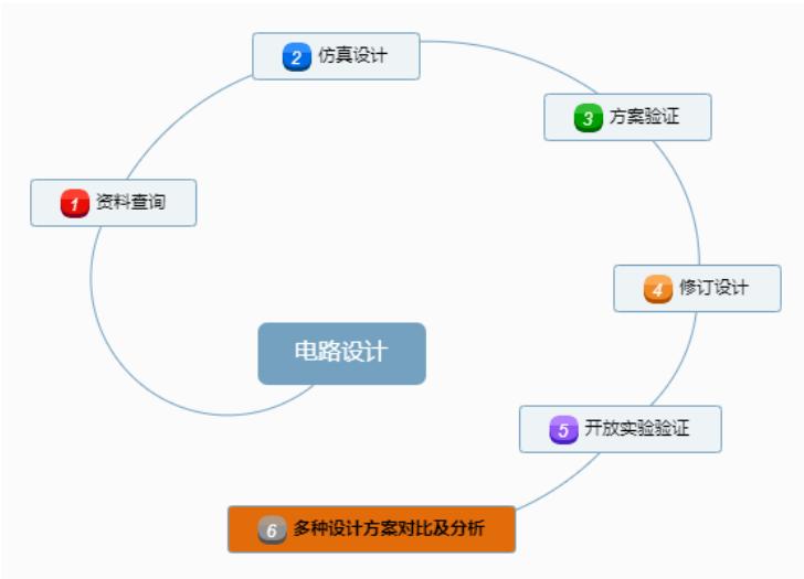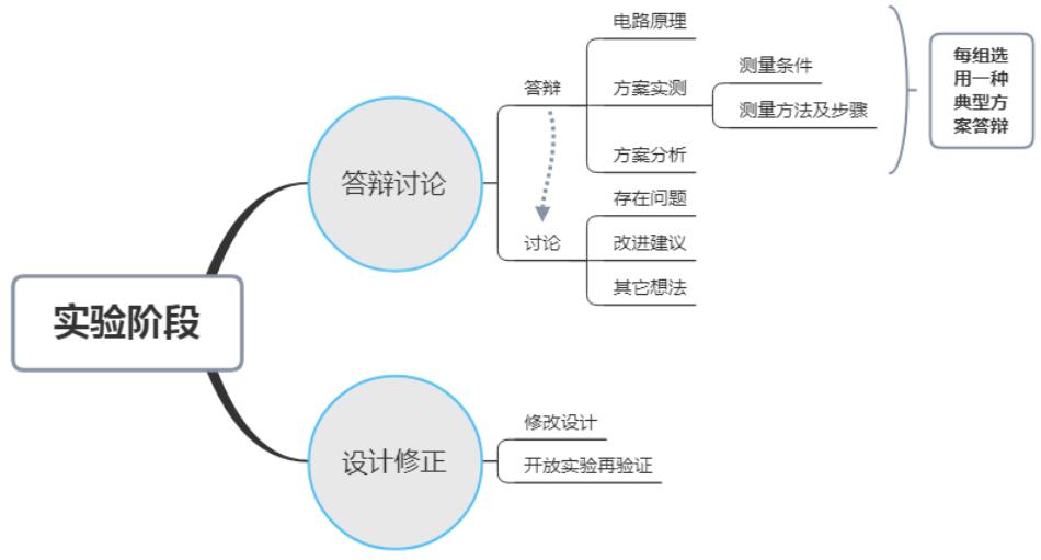 自实验任务发布至实验报告撰写之前都是学生电路设计阶段。该阶段是主要以学生设计电路为主:自行查阅资料、设计仿真电路,并在相关基础实验中验证设计思路,再通过答辩、讨论等交流想法,再次修订设计,再次利用开放实验进行设计验证。最终,完善设计,并对多个设计方案进行对比分析。