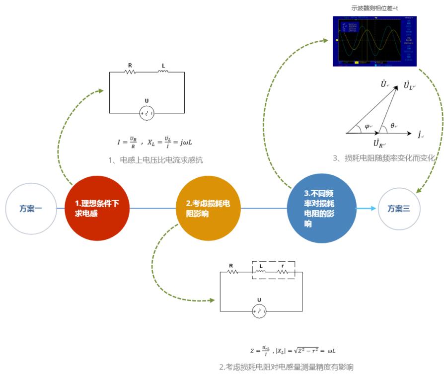 通过“方案一”的学习,知道在实际测量中损耗电阻对实际电感有影响,因此本方案中以流过整个回路的电流为测量对象,使用两种方法间接测电感量。
