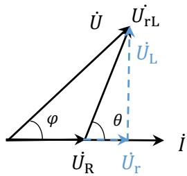$$ \begin{array} { r } { \because \theta = { \frac { \Delta t } { T } } \times 3 6 0 ^ { \circ } , { \cal Z } = r + j \omega L , \tan \theta = { \frac { \omega L } { r } } , I = { \frac { U _ { \mathrm { R } } } { R } } } \end{array} $$