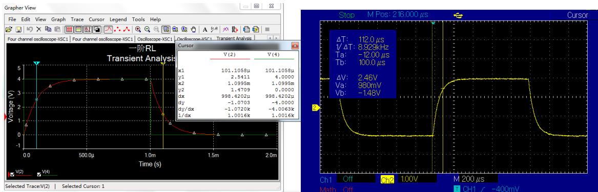 图 7-5 一阶电路全响应仿真图与实测图