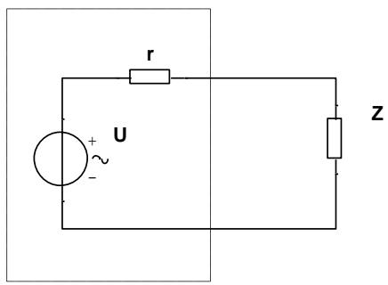 3)如果电阻R 与信号发生器内阻抗 r差距不大,调节信号发生器频率,信号发生器输出端电压也会随之变化。寻找谐振频率则需要换个思路。如图所示,谐振发生时,RLC串联外电路等效阻抗 Z 最小。内阻抗 r 与外电路等效阻抗 Z 对信号发生器电压进行分压。此时,用毫伏表观测信号发生器实际输出电压最小。