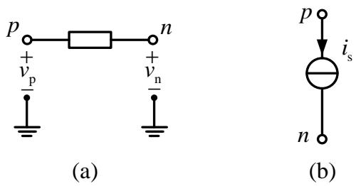 参看图 2(a),假设电阻 $R$ 连接在节点 $\mathfrak { p }$ 和节点 $\mathbf { n }$ 之间,电阻的电导为 $G$ ,节点 p和 $\mathbf { n }$ 的电压分别为 $\nu _ { \mathfrak { p } }$ 和 $\nu _ { \mathrm { n } }$ ,则流经该电阻的电流等于 $G { \Big ( } \nu _ { \mathrm { p } } - \nu _ { \mathrm { n } } { \Big ) }$ ,分别对节点 $\mathfrak { p }$ 和 $\mathbf { n }$ 列写 KCL 方程得到: