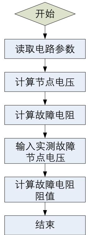 设计MATLABGUI故障诊断软件的目的是利用MATLABGUI将故障诊断的各主程序综合起来,形成一个完整的故障诊断过程,最终将软件生成可执行文件,则该故障诊断软件可在未安装 MATLAB 的计算机中独立运行。整个故障诊断软件的主体函数包括打开文件读取电路结构描述和参数,计算无故障节点电压值,计算故障字典,根据输入故障时节点电压值计算故障元件位置,最终输出故障电阻阻值,框图如下: