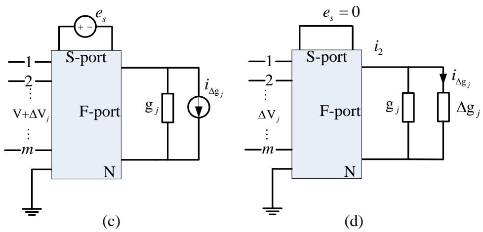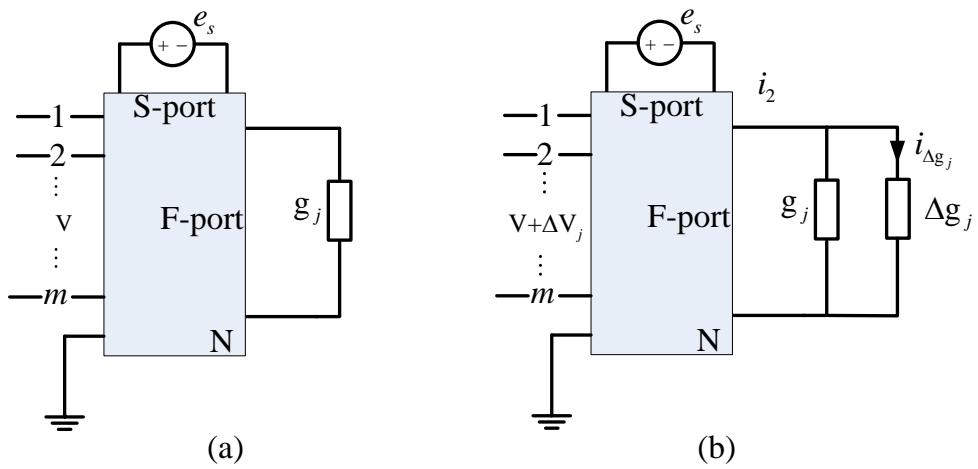 式中 $r _ { i o } \left( 1 \le i \le m \right)$ 是从独立源 $e _ { s }$ 到可测节点 $\nu _ { i } \left( 1 \leq i \leq m \right)$ 端的转移阻抗。现假定电路在端口 F-port 上的电阻 $R _ { j }$ 出现了故障,其电导值由 $g _ { j }$ 变化到 $g _ { j } + \Delta g _ { j }$ ,则各可测节点电压由此变化为 $\nu _ { i } + \Delta \nu _ { i } \left( 1 \leq i \leq m \right)$ ,如图 3(b)所示。记流过 $\Delta g _ { j }$ 的电流为 $i _ { \Delta g _ { j } }$ ,由替代定理可知,电导 $\Delta { g } _ { j }$ 可用一个电流源 $i _ { \Delta g _ { j } }$ 代替,如图 3(c)所示。此时,各可测节点的电压向量可由下式表示: