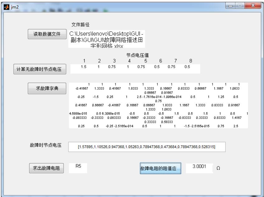5) 设计 MATLAB GUI 故障诊断软件,要求界面操作简单易用,可实现对电路中任意电阻故障的准确诊断。