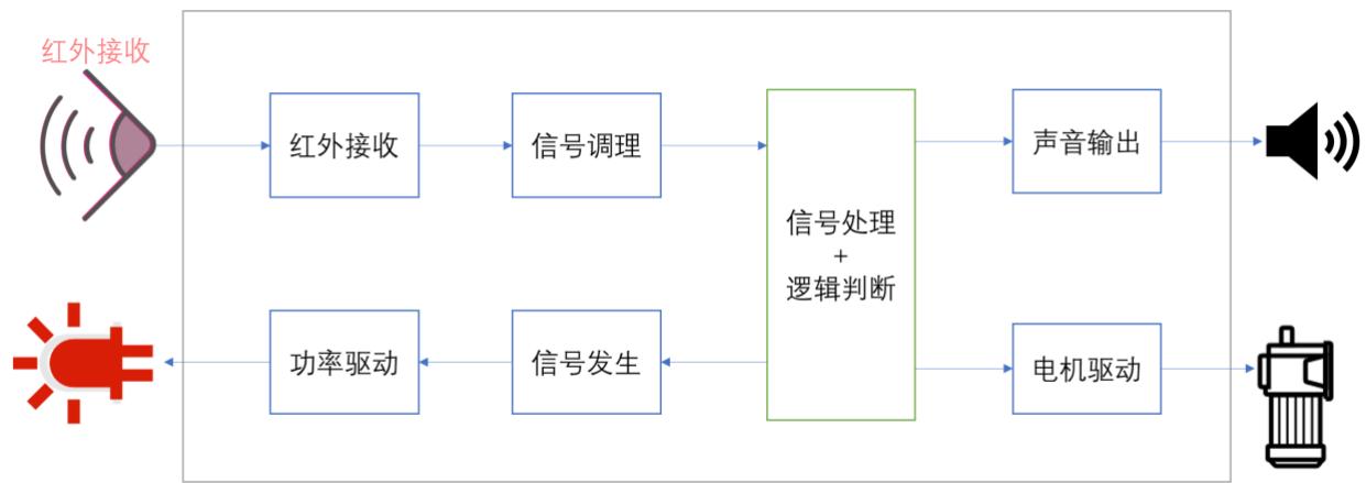 根据对项目任务书分析可知,整体系统可由红外接收传感器电路、控制电路、可见光发光电路、声音输出电路及电机控制电路构成。