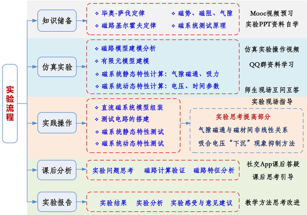 实验中涉及磁路模型建立与分析运用了基本理论知识,计算机仿真软件的运用锻炼了学生在现代工程环境下使用新设计分析手段的能,直流磁系统的组装与实验测试电路的搭建、调试等操作锻炼了电类专业学生的动手能力,学生完全自主研究设计实验,自主实践实验,自主分析实验结果,培养学生工程实践能力。