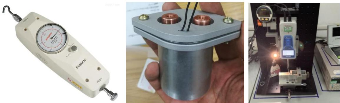 - 设置触点回路电源电压为 6v;保证线圈回路的线圈电压为 $2 8 \mathrm { v }$ ,考虑采样电阻,经过计算设置线圈回路电源电压;设置开关继电器回路电源电压为 $2 4 \mathrm { v }$ ;线圈电流及触点电压波形。同时使用测力计测试不同电压下衔铁引出推杆力值。