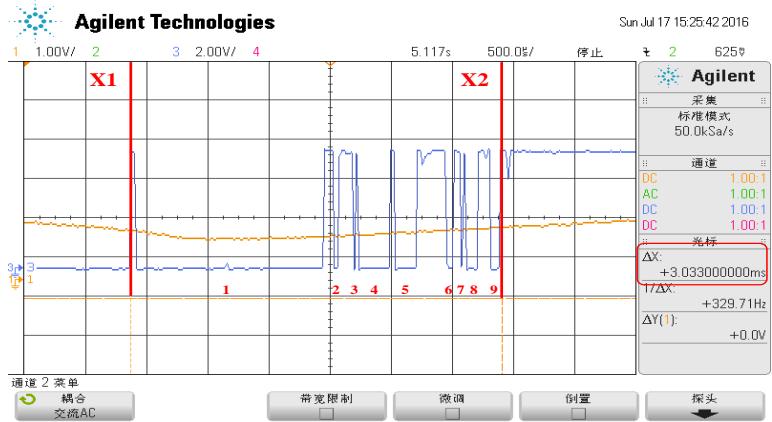 如图所示,讲 X1 和 X2 调至图中位置,吸合时间 $- \Delta \mathrm { X }$ 。多次测量,将数据记录在表 1 中。将图8-16中,X1至X2位置部分放大,得到下图 8-17。