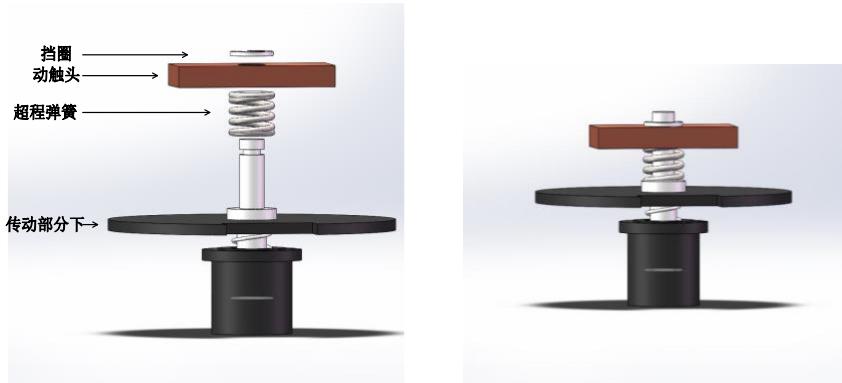 依次将挡圈、动触点、超程弹簧装在传动部分上,装配过程如图 8-13 所示;