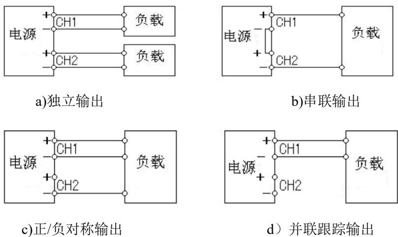 本直流稳压电源根据使用需求不同,共有下图所示四种连接方式。