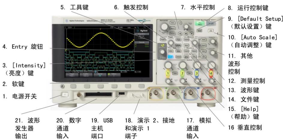 (1) 电源开关:按一次打开电源,再按一次关闭电源。(2) 软键:这些键的功能会根据现实屏上键上方显示的菜单有所改变。(3) 亮度控制键:按下该键使其亮起。该键亮起时,旋转Entry旋钮可调整波形亮度。(4) .水平控制: $\textcircled{1}$ 水平定标旋钮:可调整时间/格(扫描速度)设置。该旋钮下方的符号表示此控制具有水平定标在波形上展开或放大的效果;$\textcircled{2}$ :水平位置旋钮:可水平平移波形数据。