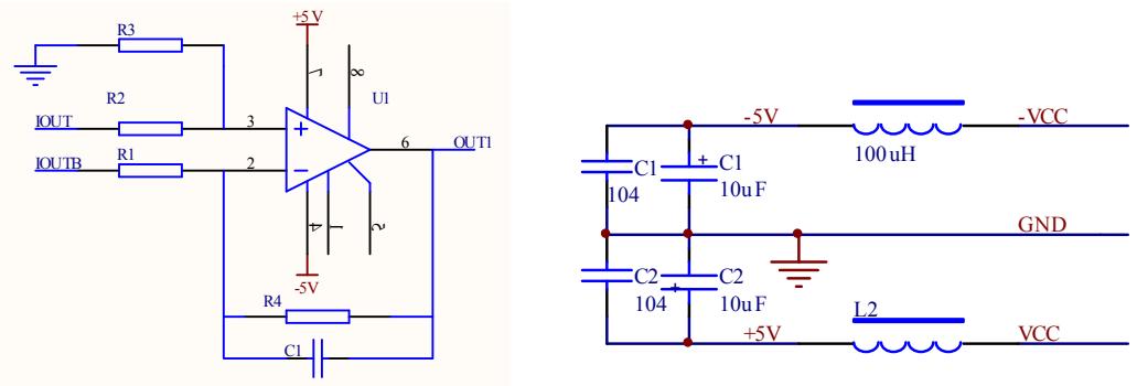 减法电路将 DDS 模块的两路输出 IOUT 和 IOUTB 进行减法运算得到 $1 \ \mathrm { V } _ { \mathrm { P P } }$ 的信号,参考电路如图所示,参数选择时要注意阻抗的匹配。其中运放根据需要进行选取,参考的型号有LM318、LHV870、OPA365、OPA857、OPA690、AD8021 等,选择运放时应注意电流型放大器和电压型放大器的区别。电源处理的参考电路如图所示。