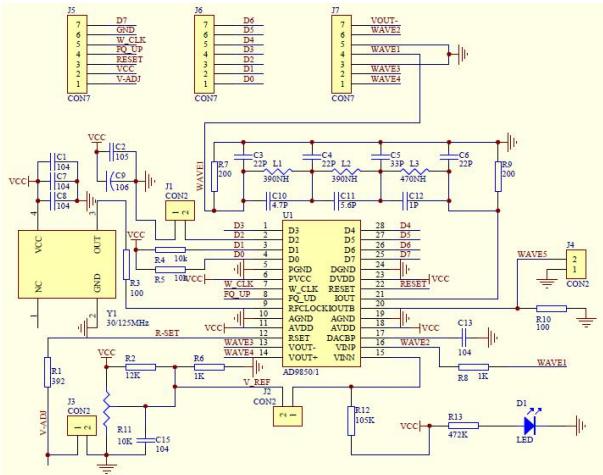 DDS 模块采用 AD9850/AD9851 芯片参考电路如图所示。该模块由单片机控制,可以采用并行控制或串行控制方式,输出频率 0-40MHz(70MHz),IOUT 和 IOUTB 输出两路 $0 . 5 \mathrm { V } _ { \mathrm { P P } }$ ,相位相反的正弦波信号,信号中有 $0 . 2 5 \mathrm { V } _ { \mathrm { P P } }$ 的直流分量,分别送入减法电路。该电路由学生自行焊接调试。