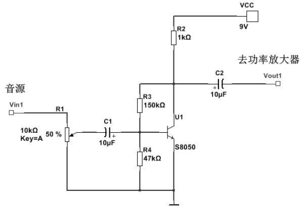 图 5 是一个非常简单的只用一个三极管构成的前置放大电路,音源信号 $\mathrm { \Delta V _ { i n 1 } }$ 通过一个电位器构成的分压电路进入共射极放大电路,经过放大后有输出端 $\mathrm { \Delta V _ { o u t 1 } }$ 送到功率放大器中尽享电路放大。该前置放大器由电位器 ${ \bf R } _ { 1 }$ 实现音量调节的作用。