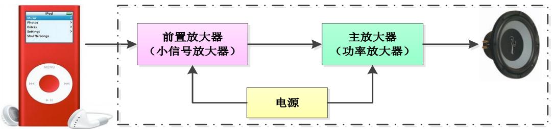 设计并制作一套如图 1 所示的立体声音响放大器。放大器由前置放大器、功率放大器、电源、立体声插头、扬声器等构成。声音信号从 MP3 播放器(或手机)输出,通过立体声插头的连接,首先进入前置放大器进行电压放大,然后在进入功率放大器进行功率放大后进入扬声器还原出声音。