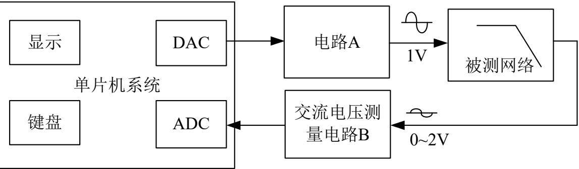 本案例为电子综合设计课程系列开放型综合设计实验之一,利用单片机小系统及外部电路,设计并制作一台简易幅频特性测量仪,能够改变输出信号的频率,施加于被测电路(二端口网络),并测量被测电路的输出电压幅度。原理可参考下图: