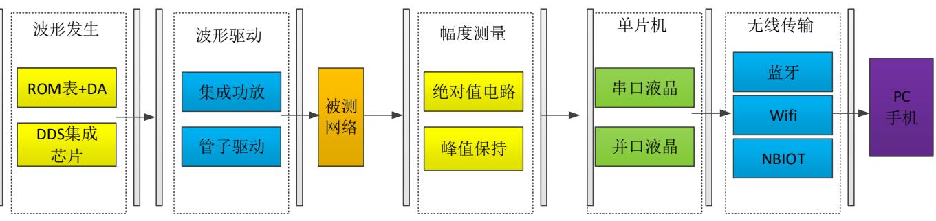 简易幅频特性测试仪系统总体结构由波形发生、波形驱动、幅度测量、单片机及显示、无线传输等模块组成。其中,波形发生用于产生幅频特性测量所需的正弦波,波形驱动用于产生低阻抗驱动信号,幅度测量可采用绝对值电路、峰值保持电路也可以采用 集成的交流检测芯片如 AD637 等,单片机包含液晶显示键盘交互及信号处理功能,最后通过蓝牙、Wifi 等无线传输至 PC 界面或手机界面。模块中,单片机系统、波形发生模块和幅度测评模块是系统的核心模块,均可采用多种方案实现,学生需要独立进行方案论证与选择。
