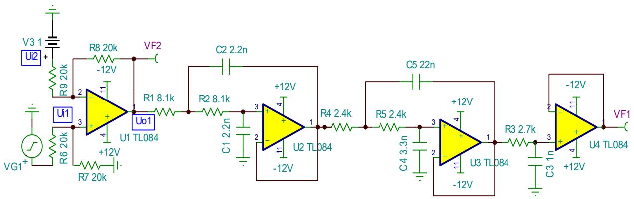 运放 U2 与 U3 组成四阶 Butter Worth 滤波器,截止频率为 $8 \mathrm { K H z }$ ,增益为一。为了削减 Sallen-key滤波器的高频馈涌现象,在电路中接入了 R3和 C3。运放U4 为电压跟随器,进行前后电路的隔离,实现输出阻抗 ${ \bf \ < } 1 0 \Omega$ 。