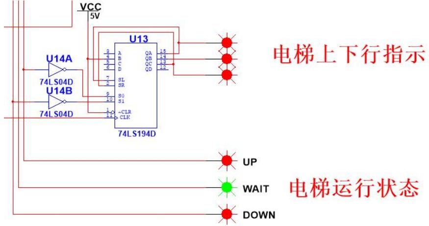 (3)能控制电梯行进(假定行进一层楼所需时间 2S),给出电梯停止、上行、下行指示。