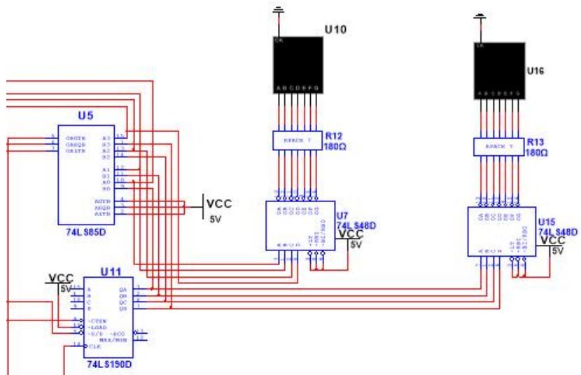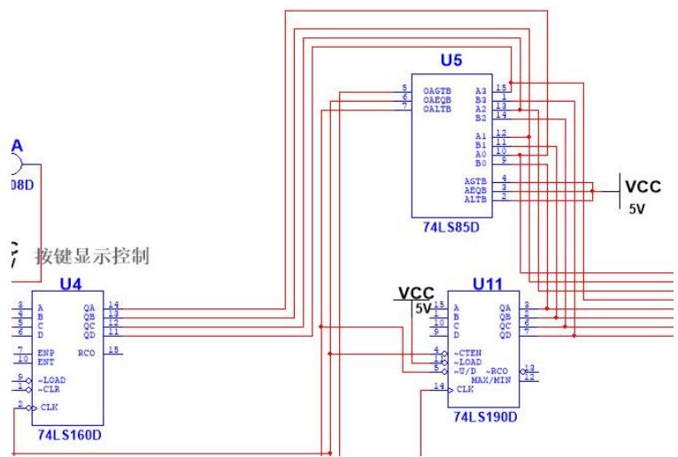 使用同步十进制加减法计数器 74LS190实现电梯上下行的计数,加减法的判断是通过 74LS190的输出反馈到 74LS85 比较器实现的。同时通过 74LS48 译码器显示实时楼层。如图 5.5.
