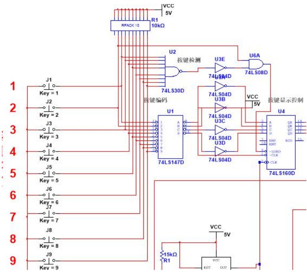 使用 10 线-4 线优先编码器 74LS147 实现对电梯楼层输入的编码。初始状态为高电平,当开关按下时为低电平。由于编码器的优先性,所以两个楼层同时按下只响应高楼层不响应低楼层,利用 74LS160 十进制计数器预置数和保持功能实现对楼层的保存,电路如图 5.1。