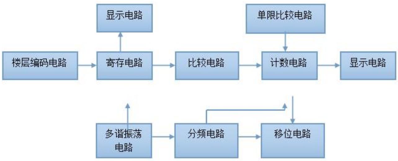 本设计为一部共有九层楼的电梯控制电路,电梯可以显示目标楼层和当前楼层,当按下目标楼层的按键后,电梯启动,此时,首先呼叫电梯的楼层具有优先权,其他楼层呼叫暂时不被相应。共有两个数码显示管,一个数码管显示目标楼层,另一个数码管从当前楼层启动,以每层 2s 的速度运行,到达目标楼层后停止。同时,电梯运行指示灯可以显示上行、下行和等待三种功能;并且配备步进电机正反转的模拟功能,在电梯上行或下行时伴有指示灯的流水闪烁。