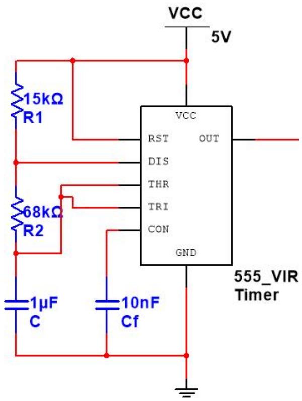 利用 555 定时器组成多谐振荡器输出固定频率的矩形脉冲。具体的电路如图 5.2。