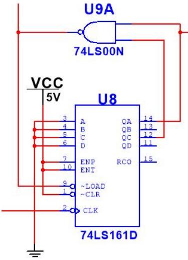 采用同步十六进制 74LS161 同与非门连接 QA 和 QC 引脚到 LOAD 置数端,实现置数控制,如图5.3。