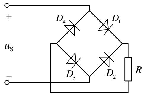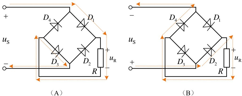 全波桥式整流电路的工作原理如下: $u _ { \mathrm { s } }$ 为正半周时,对 $D _ { 1 }$ $D _ { 3 }$ 加正向电压, $D _ { 1 }$ $D _ { 3 }$ 导通;对 $D _ { 2 }$ $D _ { 4 }$ 加反向电压, $D _ { 2 }$ $D _ { 4 }$ 截止,电路中构成 $u _ { \mathrm { s } }$ $D _ { 1 }$ $R$ $D _ { 3 }$ 通电回路,在 $R$ 上形成上正下负的半波整流电压,如图 5(A)所示。 $u _ { \mathrm { s } }$ 为负半周时,对 $D _ { 2 }$ $D _ { 4 }$ 加正向电压, $D _ { 2 }$ $D _ { 4 }$ 导通;对 $D _ { 1 }$ $D _ { 3 }$ 加反向电压, $D _ { 1 }$ $D _ { 3 }$ 截止。电路中构成 $u _ { \mathrm { s } }$ $D _ { 2 }$ $R$ $D _ { 4 }$ 通电回路,同样在 $R$ 上形成上正下负的另外半波整流电压,如图 5(B)所示。