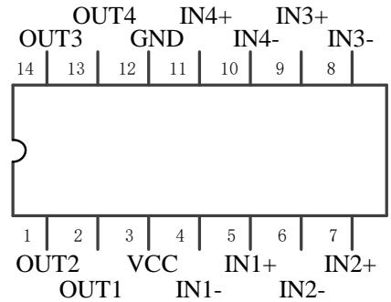 LM339 芯片内部装有四个独立的电压比较器,是一种常见的集成电路。利用 LM339 可以方便的组成各种电压比较器电路。其引脚及内部结构如图 11所示。