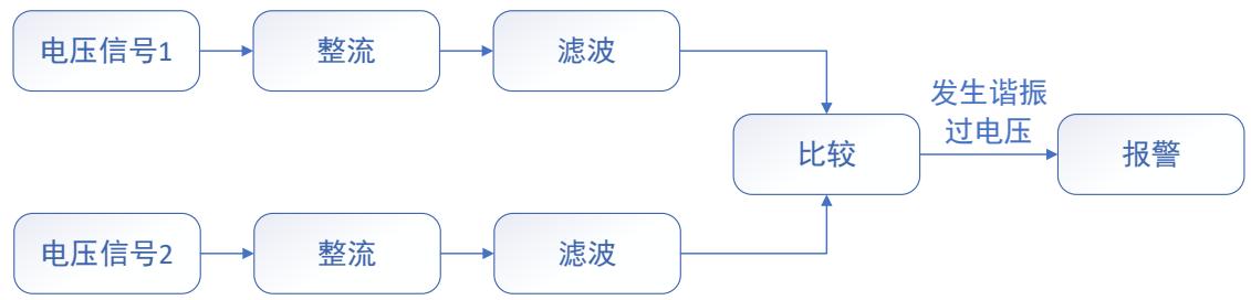 通过电压判断电路是否产生谐振过电压的思路如图 3 所示。将电压信号进行整流,将交流信号变成变化的直流信号,用滤波电路将变化的直流信号变成稳定的直流信号,通过电压比较器比较两路电压的大小,以判断电路是否发生谐振过电压。
