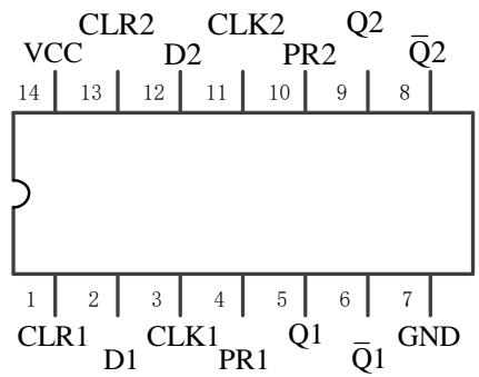74LS74 是双 $D$ 触发器,可用作寄存器,移位寄存器,振荡器,单稳态,分频计数器等功能。其引脚图如图12所示、其真值表如表 13所示。