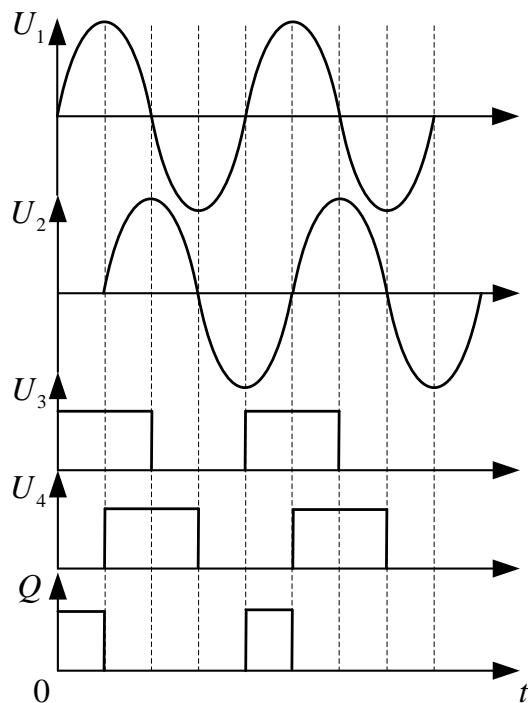 较器输出的方波信号, $Q$ 为触发器输出信号。
