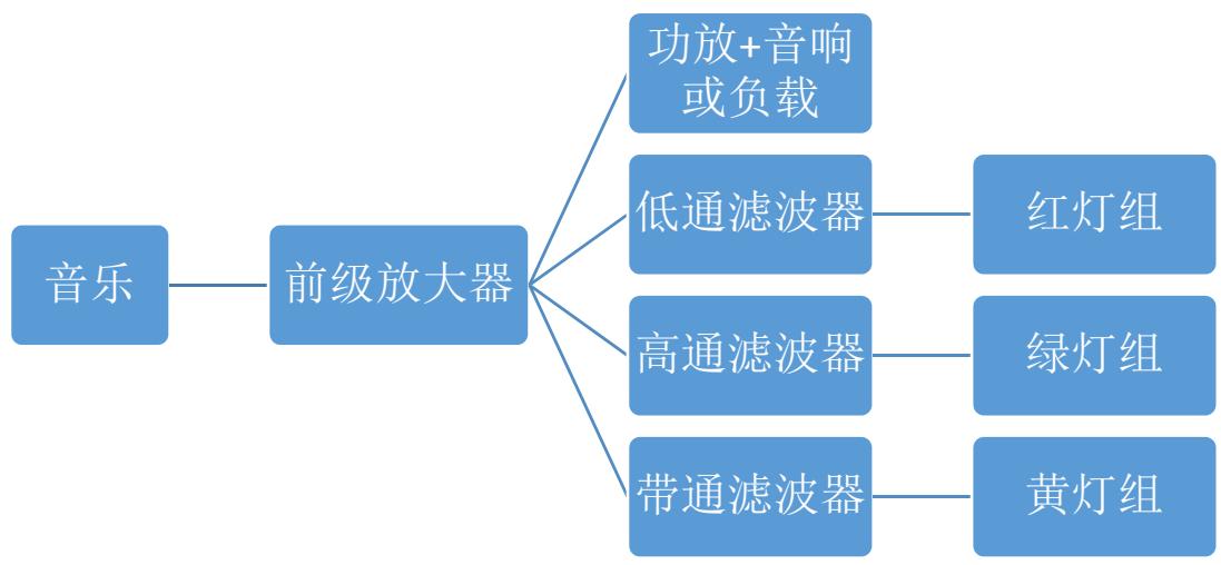 实验原理是:音乐信号通过前级电路进行适当的放大和阻抗变换后送入后级,功放电路将前级的信号继续放大到满足功率要求,滤波电路对相应的频率成分进行滤波和放大,各个灯组完成信号强度的指示。
