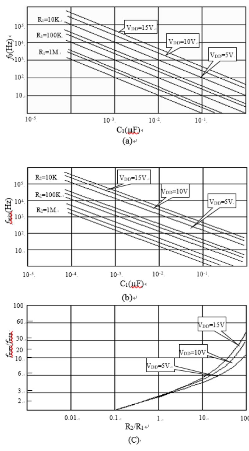VCO的输出频率最高不超过 1.5MHz,决定振荡频率的不仅和电源电压有关,而且与外接阻容元件有关。振荡频率的定时元件有 R1、R2和电容C1,无信号输入时,VCO将振荡在最低频率上。当使用不同电源时, $\mathrm { C } _ { 1 }$ 与 $f _ { 0 }$ 的关系、 $\mathrm { C } _ { 1 }$ 与 $f _ { \mathrm { m i n } }$ 的关系、 $\mathbf { R } _ { 1 } / \mathbf { R } _ { 2 }$ 和$f _ { \mathrm { m a x } } / f _ { \mathrm { m i n } }$ 的关系如图 6(a)(b)(c)所示。