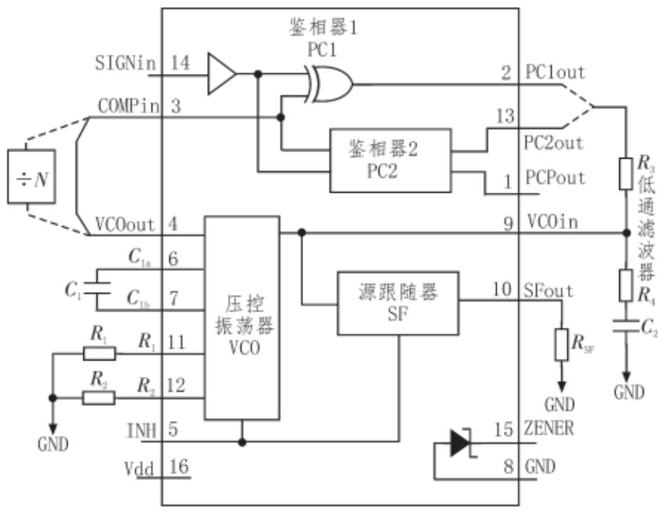 数字锁相环CD4046 由两个鉴相器、一个压控振荡器、一个源极跟随器和一个齐纳二极管组成。