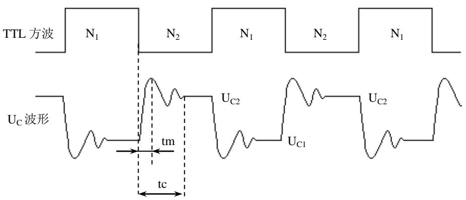 环路锁定后,相位差 $\theta _ { \mathrm { e } }$ 为一常量,鉴相器输出电压 $\mathrm { U _ { d } }$ 是一直流电压,环路滤波器输出 $\mathrm { U _ { c } }$ 也为一直流电压,用示波器可观测 $\mathrm { U _ { c } }$ 的状态变化,判定环路是否入锁。改变分频比 $_ \mathrm { N }$ 的数值,环路即刻失锁,若频差在捕捉带内,经短时间频率的牵引,又进入锁定状态。频合器从失锁到入锁的时间,称为频率转换时间 $\mathbf { t } _ { \mathrm { c } }$ 。实际测量时,可用一 TTL信号源接到 N 分频器预置码的某一位上。利用信号源的高低电平,取代对应的两个可预置码,再用示波器同时观测信号源波形和 $\mathrm { U _ { c } }$ 点的波形,从示波器上读出峰值时间 $\mathbf { t } _ { \mathrm { m } }$ 和频率转换时间 $\mathbf { t } _ { \mathrm { c } }$ 的特征参数。对应波形如图 7所示。
