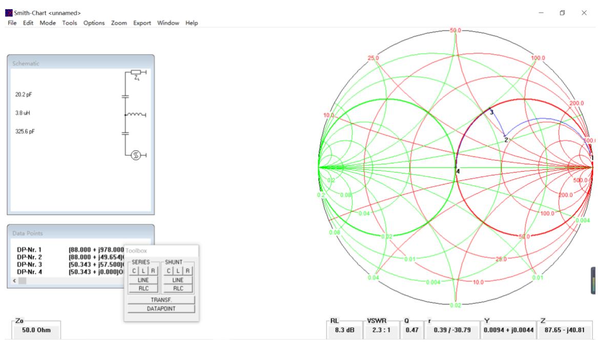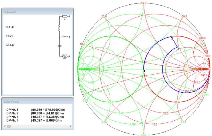 工程应用时,可以借助史密斯圆图阻抗匹配计算软件 Smith 3.1进行仿真设计,如图 5 所示。设置工作频率为 $8 . 5 \mathrm { M H z }$ ,假设某天线的初始阻抗值为 $( 8 8 . 0 2 - j 9 7 8 . 9 7 ) \Omega$ ,处于图 5中的点1。经过串联电感 $2 0 . 1 \mu \mathrm { H }$ ,使等效阻抗经过等实部阻抗线移动至点 2。再经过并联电感 $5 . 8 \mu \mathrm { H }$ ,使等效阻抗经过等实部导纳线移动至点 3。最后,经过串联电容 $2 2 4 . 6 \mathrm { p F }$ ,使等效阻抗经过等实部阻抗线移动至点 4。可以看出,点4接近史密斯圆图的原点,代表阻抗约为 $5 0 \Omega$ ,至此,阻抗匹配完成。