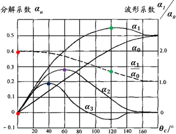 高频谐振功放一般多用于发射机的末级电路,是发射机电路的主要组成部分。高频谐振功放电路的电流消耗往往要占到整机耗电量的绝大部分,所以功率放大器工作状态的优劣以及工作效率的高低就相当重要。高频谐振功放一般采用丙类谐振放大器,不同的倍频导通角的选择原则可以参考图3,可以看出,为了兼顾输出功率和效率,导通角通常取值范围为 $\theta c = 6 0 ^ { \circ } { \sim } 8 0 ^ { \circ }$ ,工程应用中一般取 $. \theta c = 7 0 ^ { \circ }$ 左右。 $\theta c { = } 6 0 ^ { \circ }$ 时, $\alpha _ { 2 }$ 达到最大值, $\theta c = 4 0 ^ { \circ }$ 时, $\alpha _ { 3 }$ 达到最大值,这些数值是设计倍频器的参考值。